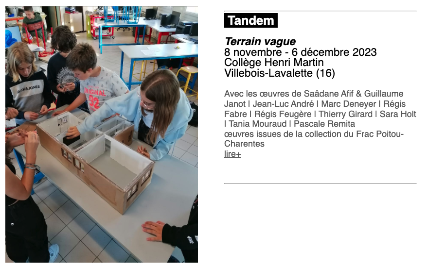 Frac ? Ces quatre lettres signifient Fonds Régional d’Art Contemporain, c’est-à-dire une collection d’œuvres d’art contemporain implantée en région. Il y a 22 Frac en France qui ont été créés au début des années 1980 afin de réduire les disparités culturelles sur le territoire et de rendre la création contemporaine accessible au plus grand nombre. Grâce à ces 22 collections publiques, les habitants d’un territoire peuvent découvrir au plus près de chez eux des œuvres d’artistes originaires des 4 coins du globe. Comment ça marche ? À partir de sa collection d’œuvres - qui sont conservées dans des réserves à Linazay, le Frac Poitou-Charentes propose des expositions d’art contemporain Les expositions Le Frac propose des expositions dans son site d’Angoulême et plus ponctuellement dans son site de Linazay. Dans ses expositions, le Frac Poitou-Charentes propose des rendez-vous : En pratique :
